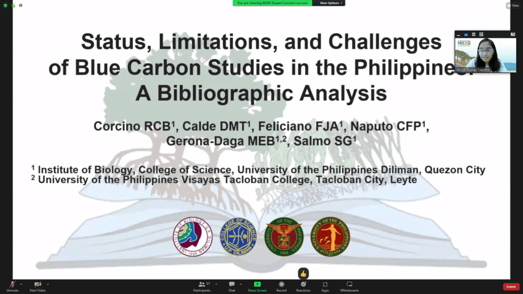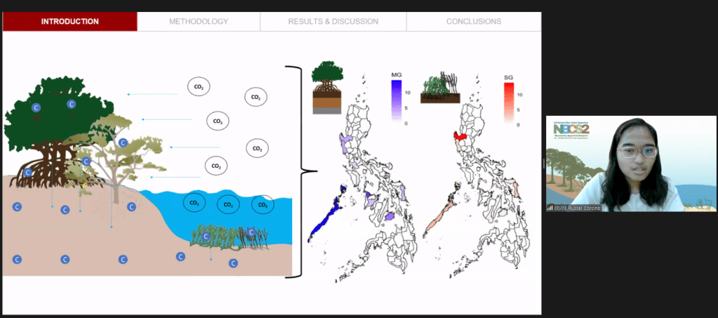 Russel Christine Corcino, Science Research Specialist II of Integrated network-based management for SEA coasts (InMSEA) Project presents the paper “Status, Limitations, and Challenges of Blue Carbon Studies in the Philippines: A Bibliographic Analysis” at the 2nd National Blue Carbon Symposium (NBCS-2). The virtual conference was held last May 24-25, 2022 as part of the JICA assisted BlueCARES Project.