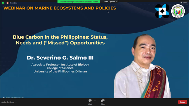 Dr. Sev Salmo was one of the speakers on a ๐ช๐ฒ๐ฏ๐ถ๐ป๐ฎ๐ฟ ๐ผ๐ป ๐ ๐ฎ๐ฟ๐ถ๐ป๐ฒ ๐๐ฐ๐ผ๐๐๐๐๐ฒ๐บ๐ ๐ฎ๐ป๐ฑ ๐ฃ๐ผ๐น๐ถ๐ฐ๐ถ๐ฒ๐ last Jun 24, 2022 organized by the National Academy of Science and Technology (NAST). His talk entitled โBlue Carbon in the Philippines: Status, Needs, and (โMissedโ) Opportunitiesโ discussed the importance of blue carbon ecosystems and the challenges in conserving these critical ecosystems.
