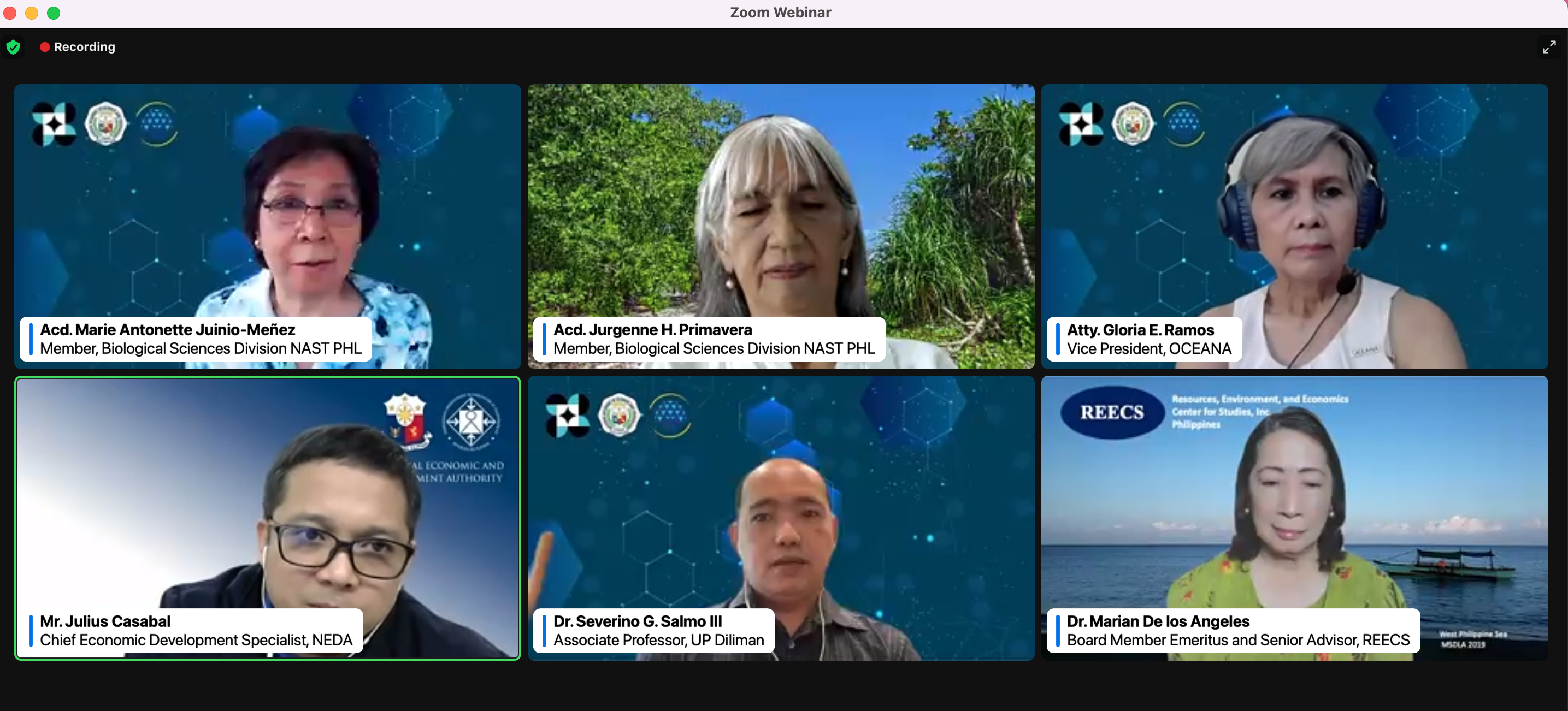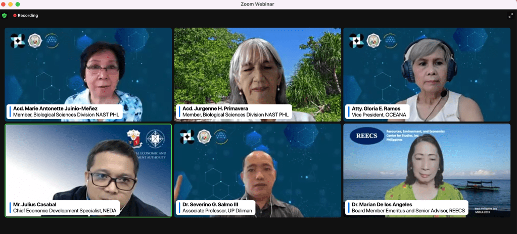 Together with Dr. Sev as resource speakers were Dir. Natural of ANRES-NEDA (represented by Mr. Julius Casabal, Chief Economic Development Specialist during the Q&A forum) and Academician Primavera, a member of Biological Sciences Division of NAST Philippines. Atty. Ramos and Dr. De Los Angeles acted as reactors. This webinar was moderated by Academician Marie Antonette Antonio-Meรฑez.