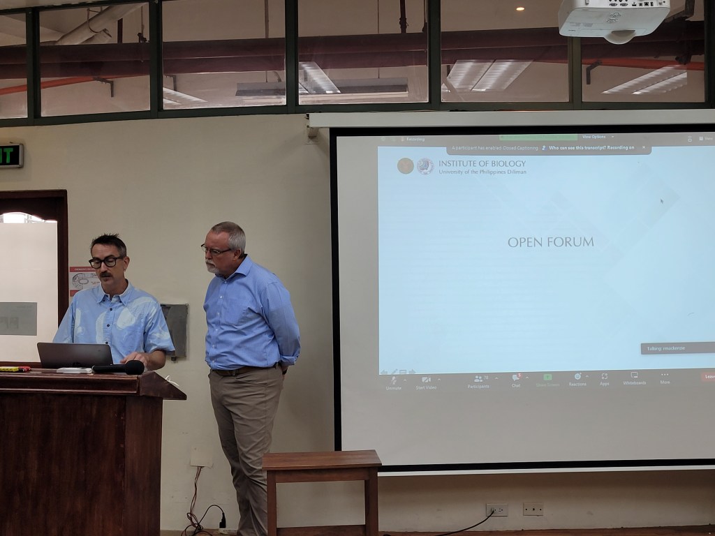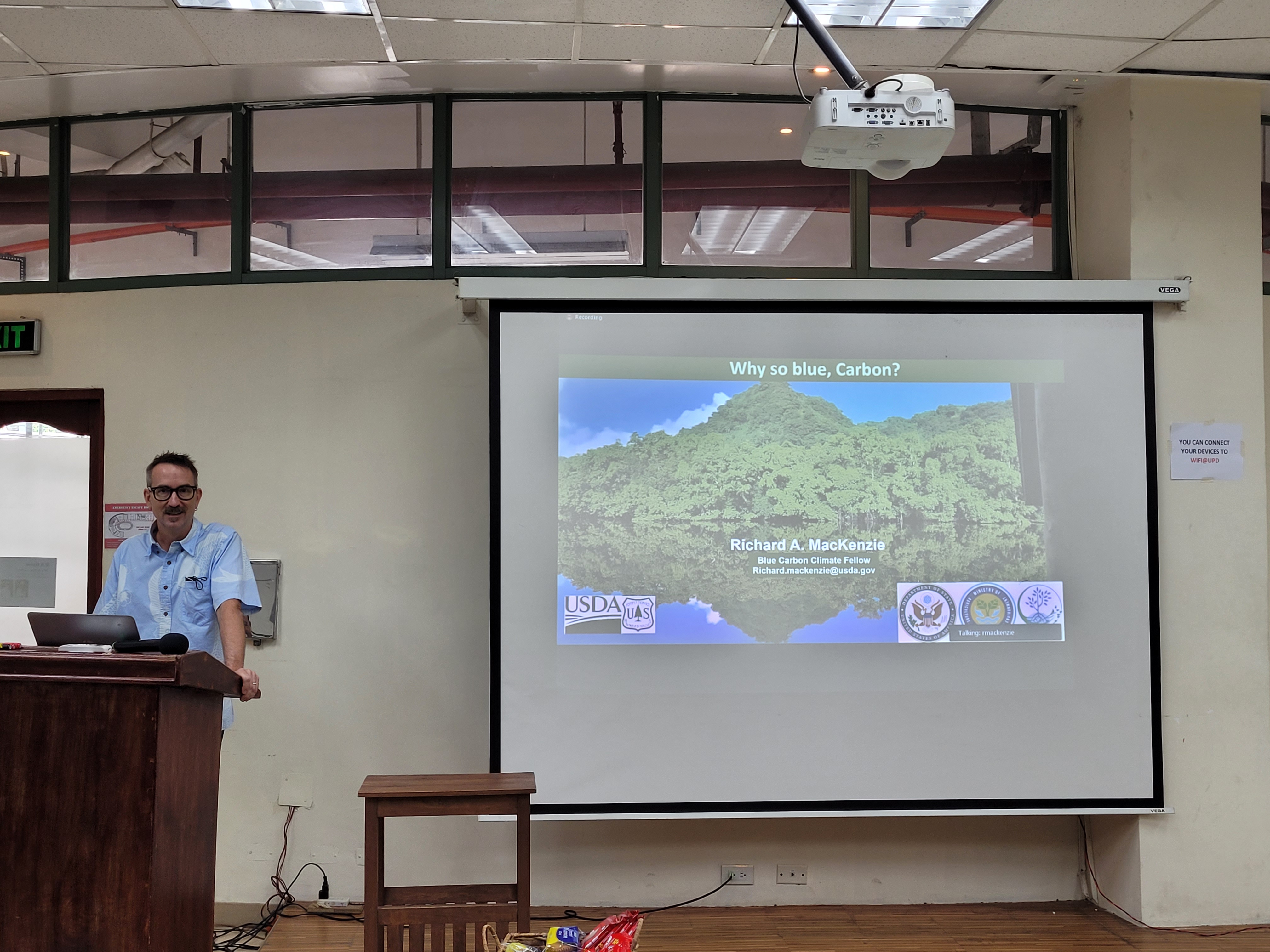 Dr. Richard MacKenzie about to start his talkDr. Ken Krauss moments before his talkDr. MacKenzie and Dr. Krauss answering questions during the open forumL-R: Dr. MacKenzie, Dr. Severino G. Salmo III (Project Leader, PEER ManCoRe), Dr. Krauss, and Dr. Ian Kendrich Fontanilla (Director, Institute of Biology)Why So Blue, Carbon? In-person participantsDr. Salmo giving a tour of the WATER LaboratoryDr. Salmo, co-head of the WATER Laboratory, Dr. MacKenzie, and Dr. Krauss with the laboratory members