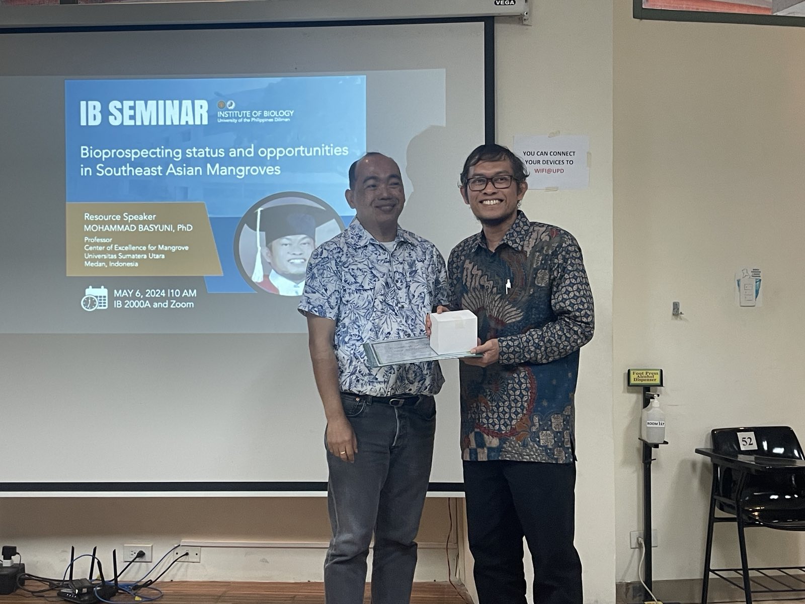 Dr. Mohammad Basyuni, a professor from the Universitas Sumatera Utara, Indonesia, and a collaborator of the PEER ManCoRe project, delivered his seminar titled, “Bioprospecting status and opportunities in Southeast Asian Mangroves,” at the Institute of Biology last May 6, 2024. Through the seminar, Dr. Basyuni shared the status of his research on mangrove bioprospecting in Southeast Asia and its potential applications for the treatment of diseases including colorectal cancer and COVID-19. The seminar was attended by IB Director, Dr. Ian Kendrich Fontanilla, and PEER ManCoRe Project Leader, Dr. Severino G. Salmo III, along with various faculty, staff, and students at the Institute of Biology.