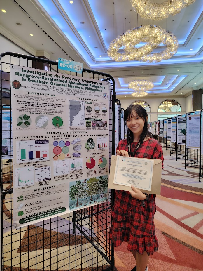The PEER-funded integrative study titled, “Investigating the Recovery Trajectory of Mangrove-Recolonized Abandoned Fishponds in Southern Oriental Mindoro, Philippines” qualified for Poster Presentation at the 46th NAST Annual Scientific Meeting (ASM) held on July 10, 2024 – July 11, 2024, with the theme “Beyond Farm Productivity: Transforming the Philippine food system to address equity, consumer health, and environmental issues” at The Manila Hotel . The study investigated the recovery potential of mangrove-recolonized abandoned fishponds using three bio-indicators: litter production and decay, lichen assemblages, and mollusk assemblages. Overall results imply that naturally recolonized abandoned fishponds can mature into functional mangroves over time. Depending on site-specific conditions, recolonized ponds will mature slower than routine recolonized mangroves but faster than planted(monospecific) stands.