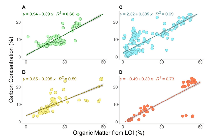 Measuring soil carbon stock (SCS) is vital in assessing the role of mangroves in sequestering atmospheric carbon. SCS is estimated using a variety of methods. The Philippines, and practically most Southeast Asian (SEA) countries, measure SCS through the loss-on-ignition [LOI] method. LOI estimates soil organic matter (OM), then converted into organic carbon (OC) using a conventional conversion equation (%Corg=0.415 * % LOI+2.89, R2=0.59, n=78). The conversion equation was developed from Palau mangroves. While the LOI method provides an economical way of measuring SCS, it leads to less accurate estimates compared to costly elemental analyzers.