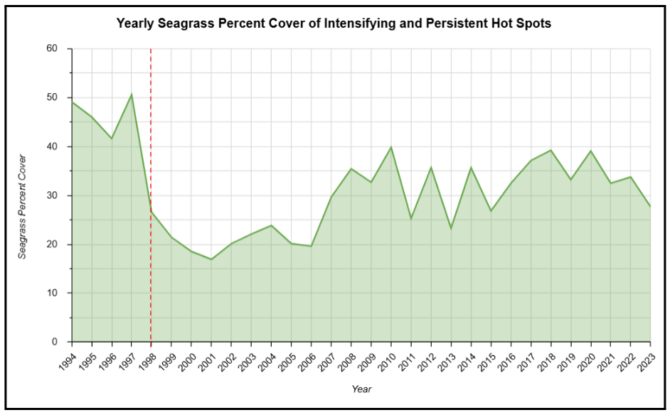 Figure captions: SST Hotspots based on the analysis of SST data from 1998 to 2023 (left). Yearly Seagrass Percent Cover in Intensifying and Persistent Hot Spot Areas. The red line marks the start of the power plant’s operation (right).