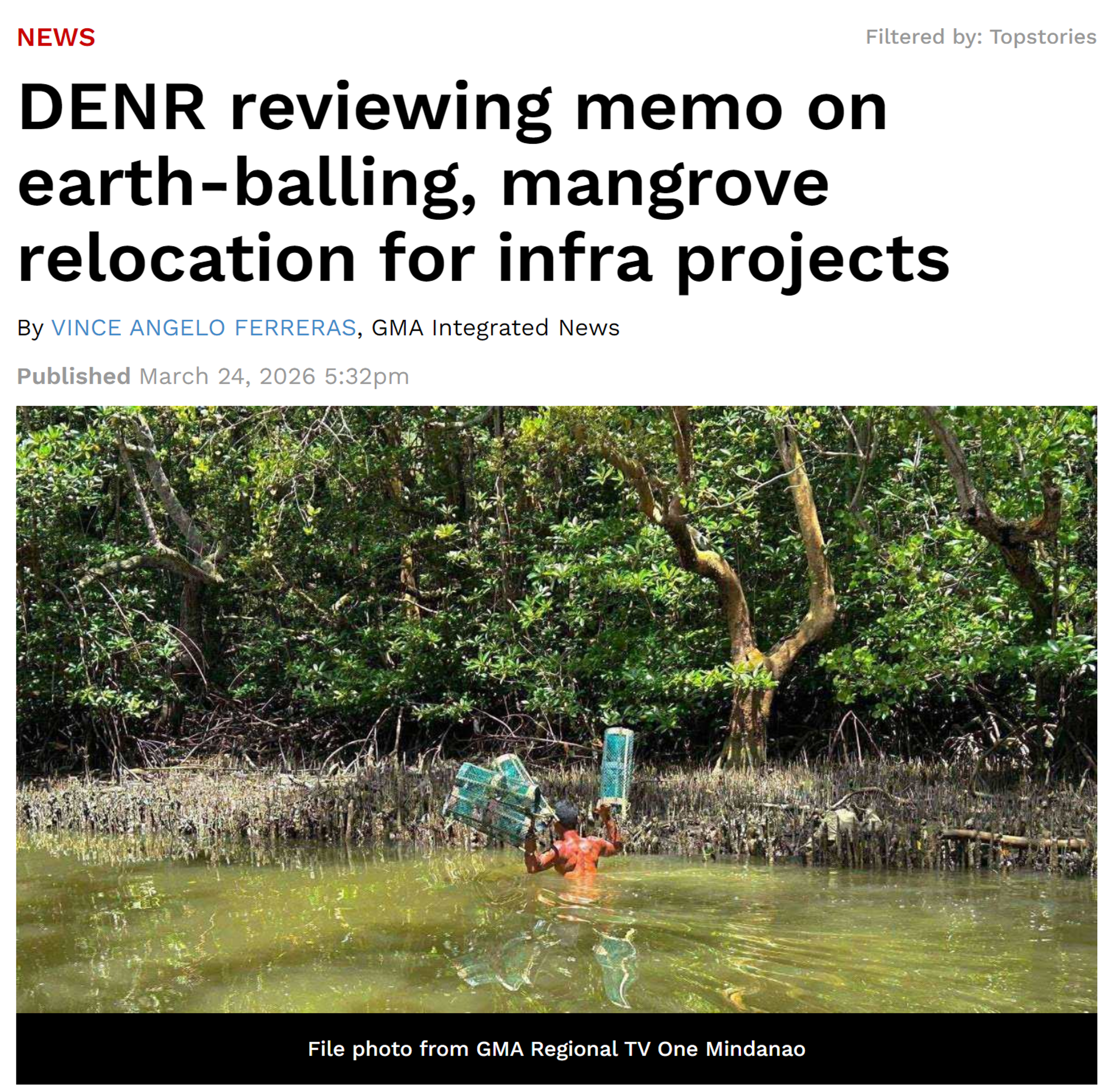 The Department of Environment and Natural Resources (DENR) is currently reviewing its October 8, 2025 Memorandum “Interim Operational Guidance and Conditions on the Earth-Balling and Relocation of Mangroves in Exceptional Circumstances“. See story by GMA Integrated News.